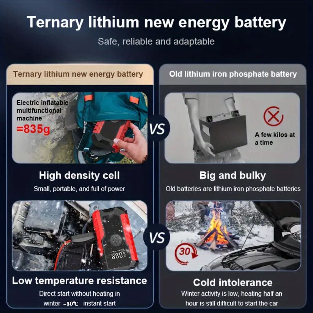 The Dynara Jump Starter is powered by a ternary lithium new energy battery, offering high-density cells that ensure long-lasting power and performance.