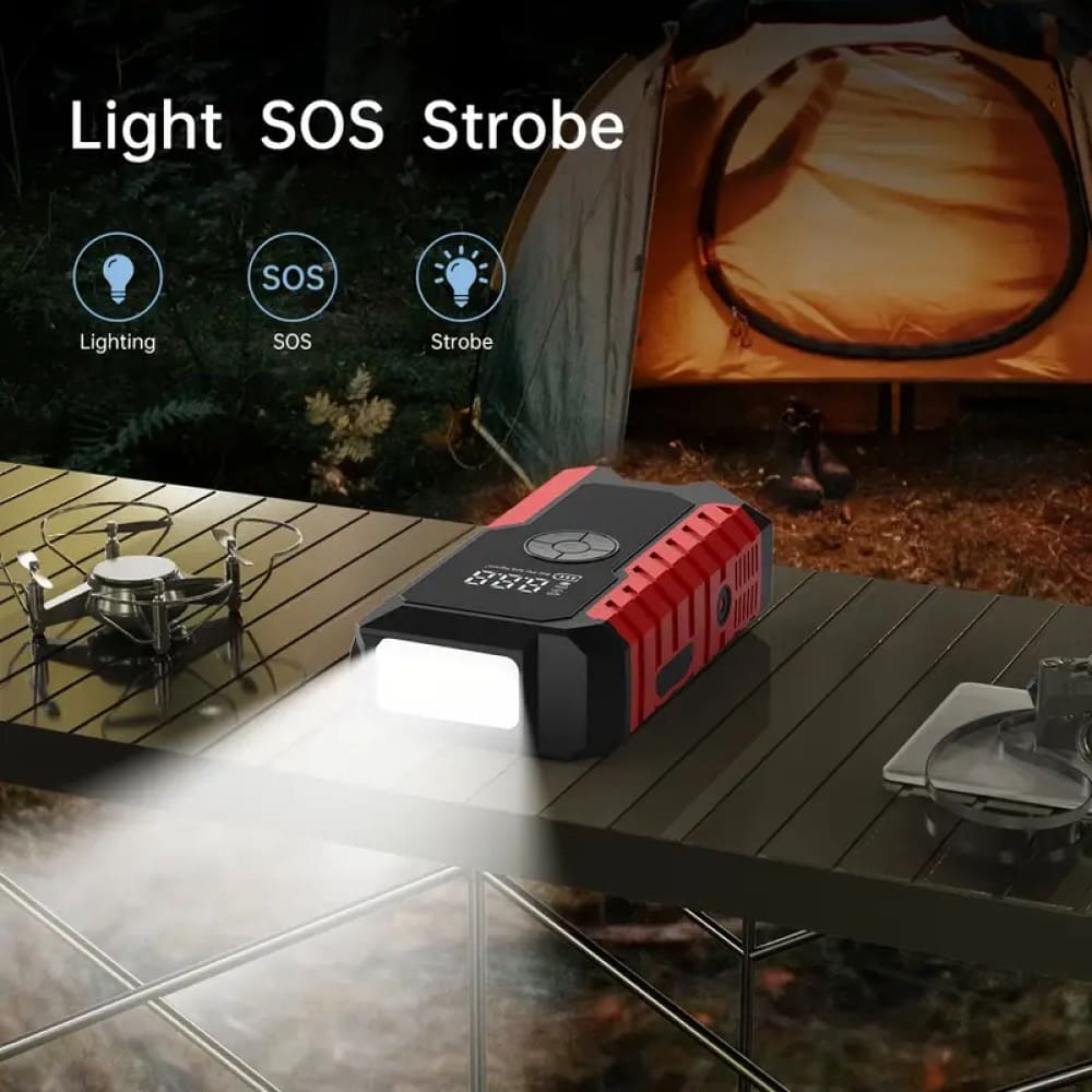 This portable jump starter air compressor features multi-function lighting, including SOS and strobe modes, making it the perfect tool for emergency situations.