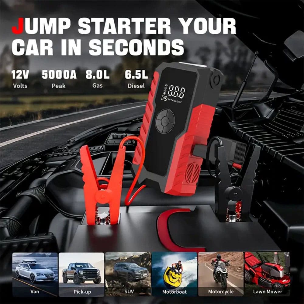 5000A Peak Jump Starter & Air Compressor – A multi-functional device designed for cars and inflatables. It combines a jump starter, car battery charger, and electric air pump into one convenient tool. Whether you're jump-starting your car, inflating air mattresses, or charging your devices, this device has you covered. With 5000A Peak power, it's suitable for most cars, SUVs, and trucks, ensuring quick starts during emergencies.